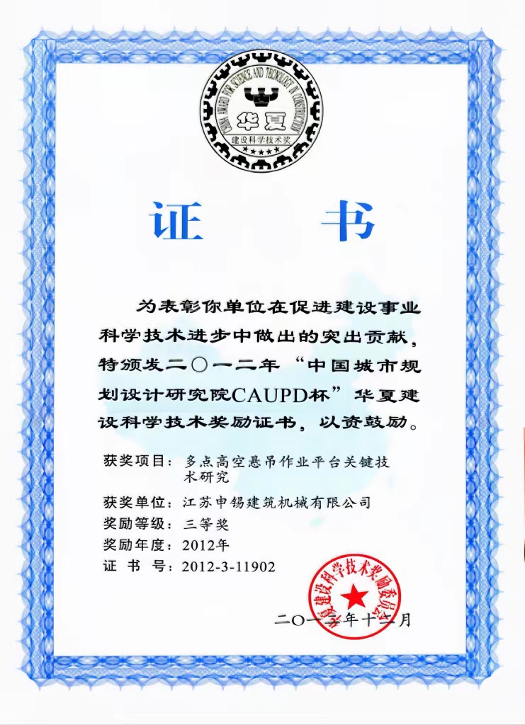 這次合作奠定了申錫企業(yè)與沈陽建筑大學(xué)之間的校企合作走深走實,之后企業(yè)先后參加了國家“十二五”、國家“十三五”等科研任務(wù)的聯(lián)合研制,雙方共同的努力換來了碩果累累,完成的"大型工業(yè)建筑設(shè)備安裝無腳手架安裝作業(yè)裝備技術(shù)研究與產(chǎn)業(yè)化開發(fā)"獲得2016年遼寧省科學(xué)進步二等獎,完成的“超高建筑維修起重平臺關(guān)鍵技術(shù)研發(fā)與產(chǎn)業(yè)化” 獲得2019年的華夏建設(shè)科學(xué)技術(shù)獎,完成的“超高異形建筑用施工平臺關(guān)鍵技術(shù)與產(chǎn)業(yè)化” 獲得2020年遼寧省科學(xué)進步一等獎……成績的獲得離不開科研人員的努力,更離不開學(xué)校及校領(lǐng)導(dǎo)多年來對申錫的支持和幫助。